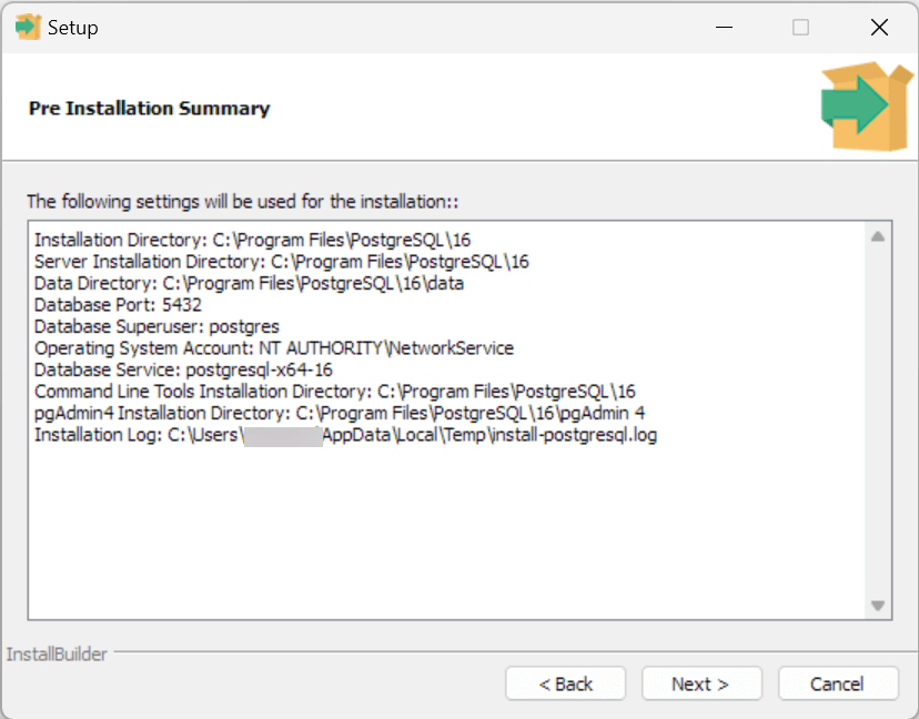 Step 9\. The setup wizard will show the summary PostgreSQL information. Review the details, and if everything is correct, click the Next button. Otherwise, click the Back button to adjust the configuration accordingly.
